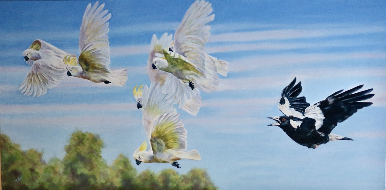 Photography reference used for the Magpie by Ian Wilson BirdLife Photography. I often watch the magpies chasing the cockatoos away and I wanted to capture this in my painting.