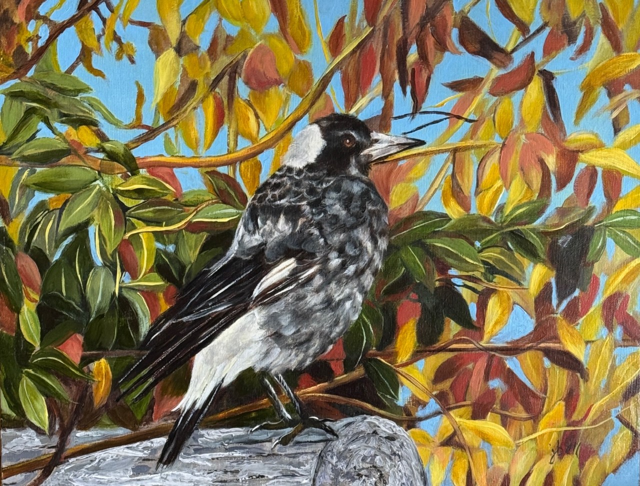 Autumn Maggie Date: 05/04/2025Author: jeninebell Category: Birds Tags: ART, autumn, bird, Birds, JENINEBELLARTIST, magpie, painting, WILDLIFE Post navigation ← Fairy Wren Three Mates → MEDIUM: OIL ON BOARD SIZE; 35.5CM X 45.5CM FOR SALE Share this: Share on X (Opens in new window) X Share on Facebook (Opens in new window) Facebook Like Loading... Related