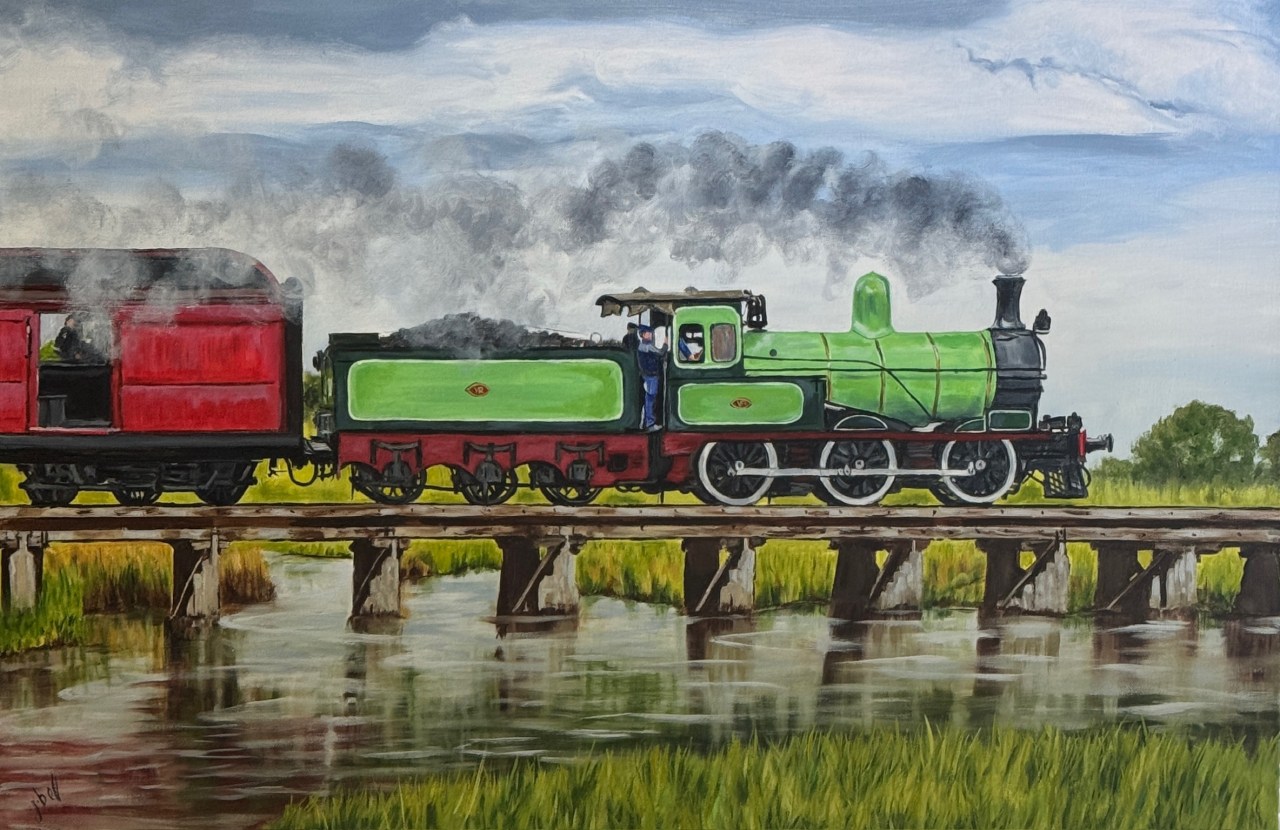 Creek Crossing Date: 31/12/2025Author: jeninebell Category: Landscapes Tags: ACLASS, ART, JENINEBELLARTIST, landscape, painting, train Post navigation ← Thunder Drama at Gundagai Sunlit Grace → MEDIUM: OIL ON STRETCHED CANVAS SIZE: 60.9CM X 90.4CM FOR SALE Share this: Click to share on X (Opens in new window) X Click to share on Facebook (Opens in new window) Facebook Like Loading... Related